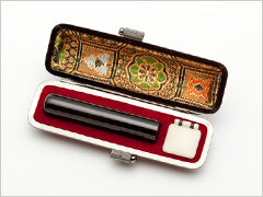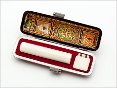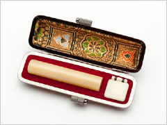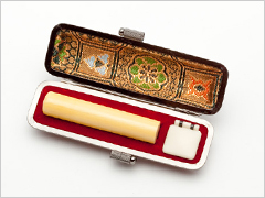 印章は一生モノ。きれいな印影を永く保つ丈夫な印材は、使えば使うほど愛着の湧く美しい印材を選びたいものです。横田印房では、永く大切に使っていただきたい為、材質は象牙・牛角・黒水牛・柘植の4種類の質が細密で堅牢な天然素材をおすすめしております。